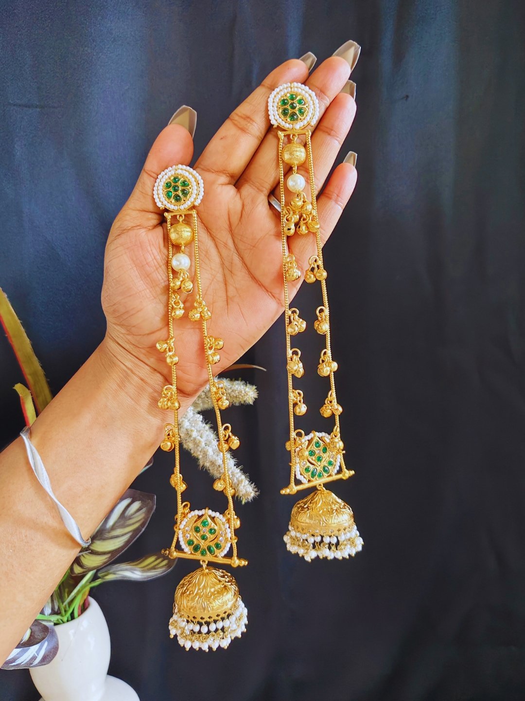 The luxurious gold plating enhances the durability and radiance of these earrings, ensuring they stand out at every occasion. The long, dangling design creates a striking visual statement, gracefully swaying as you move. Whether you’re attending a festive celebration, wedding, or any special event, the understated sheen and intricate detailing of these earrings will elevate your ensemble effortlessly. Their lightweight design ensures comfort for extended wear, making them both glamorous and practical.