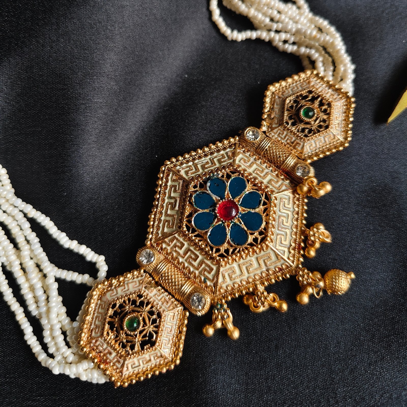 This exquisite brass chocker is a stunning addition to any jewelry collection. Crafted with care, it features multiple strands of lustrous pearls that elegantly drape around the neck, creating a sophisticated look perfect for both casual and formal occasions.