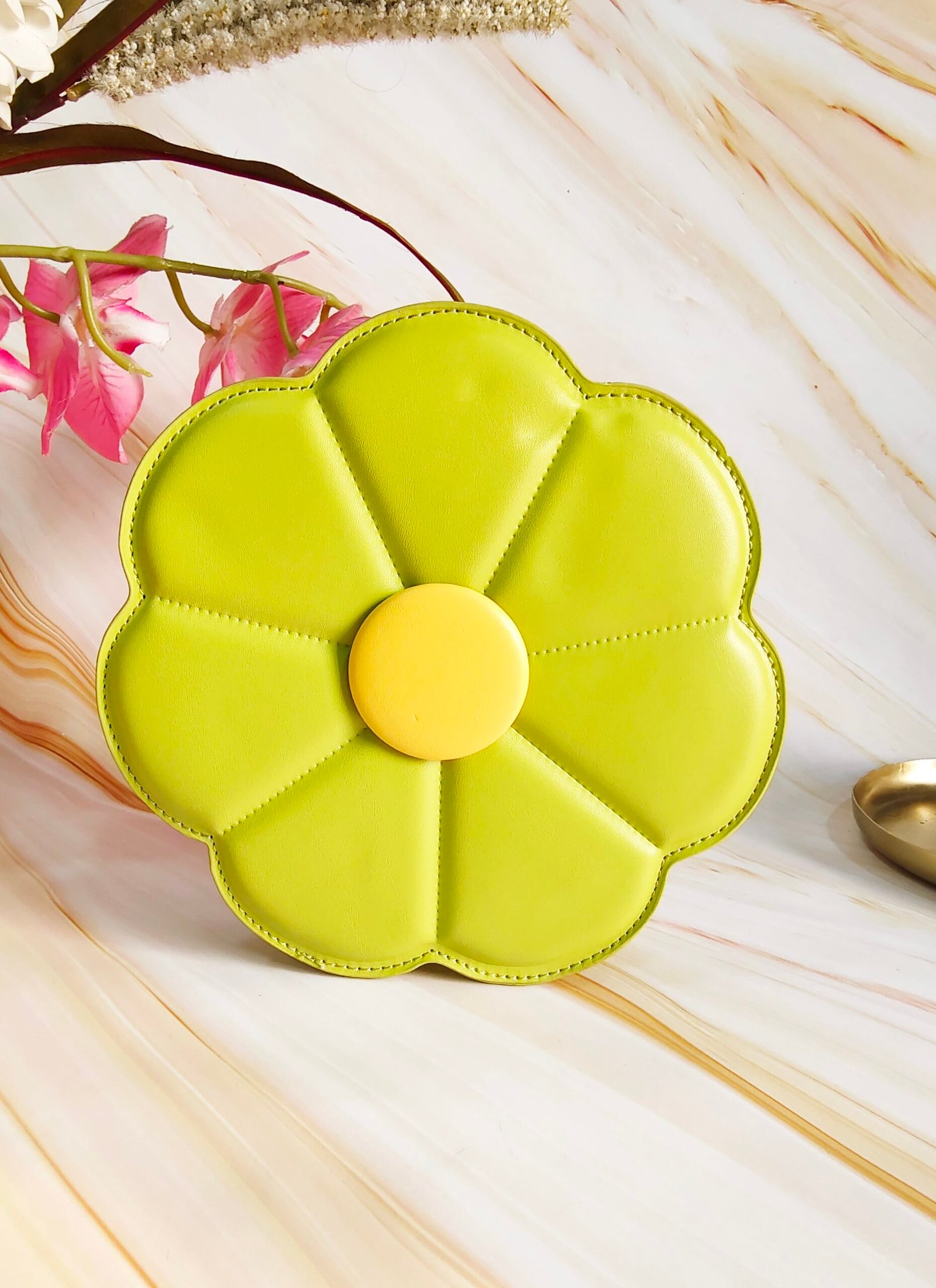 Elegant Green Flower-Shaped Leatherette Handbag with Sling Strap – Unique Statement Bag for Women