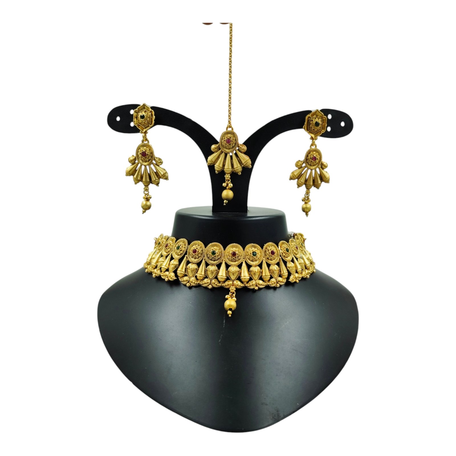 This exquisite temple designed brass choker is a stunning addition to any jewelry collection. Crafted with precision, it showcases intricate patterns that reflect traditional artistry. The choker is complemented perfectly by matching earrings and a beautiful mangtika, providing a complete look for special occasions.