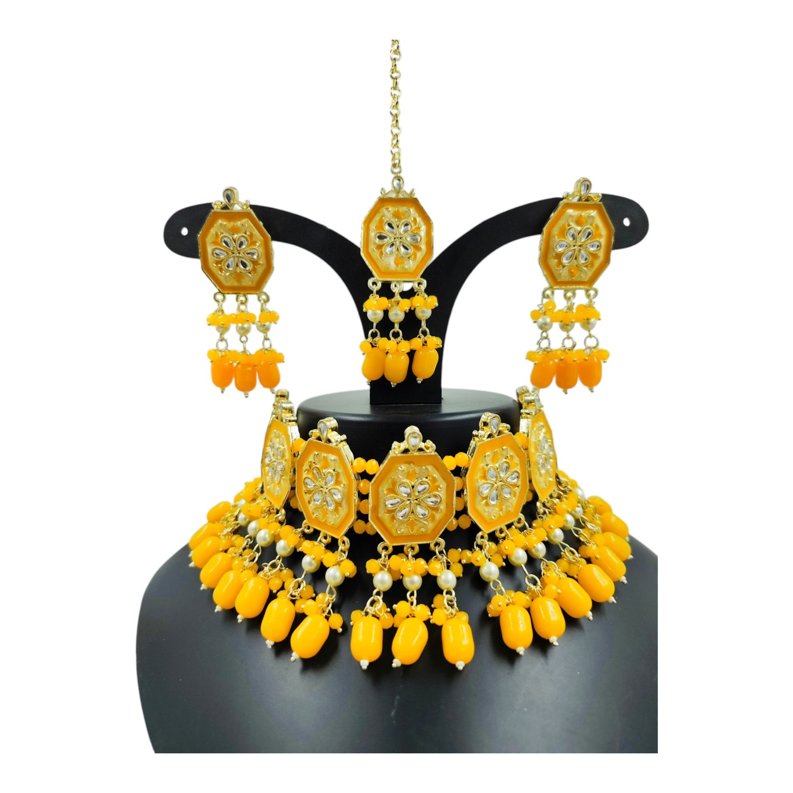 This beautiful choker set comes complete with matching earrings and a mangrika, making it a perfect choice for festive occasions or weddings. The key highlight of this set is its vibrant meenakari work, which complements the shimmering kundan stones. Together, they create a harmonious and eye-catching jewelry ensemble.
