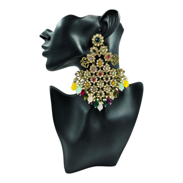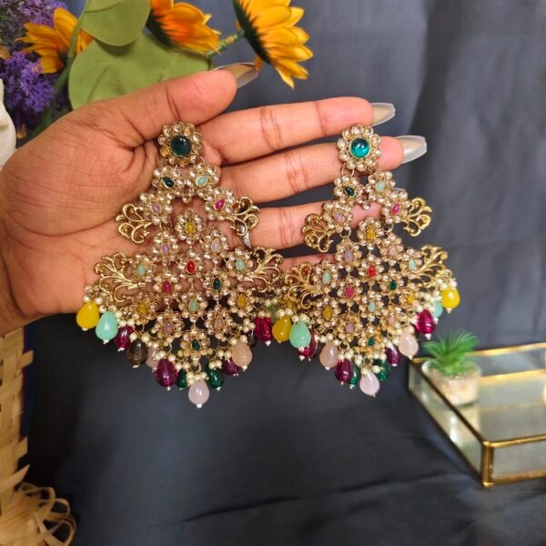 Make a bold style statement with these stunning big chandbali earrings, beautifully crafted with intricate kundan work and sparkling crystals. Designed to catch the light and dazzle, these earrings feature vibrant tones that add a pop of elegance to any ethnic ensemble. Perfect for weddings, festive celebrations, and special occasions, these earrings blend traditional craftsmanship with a contemporary edge.